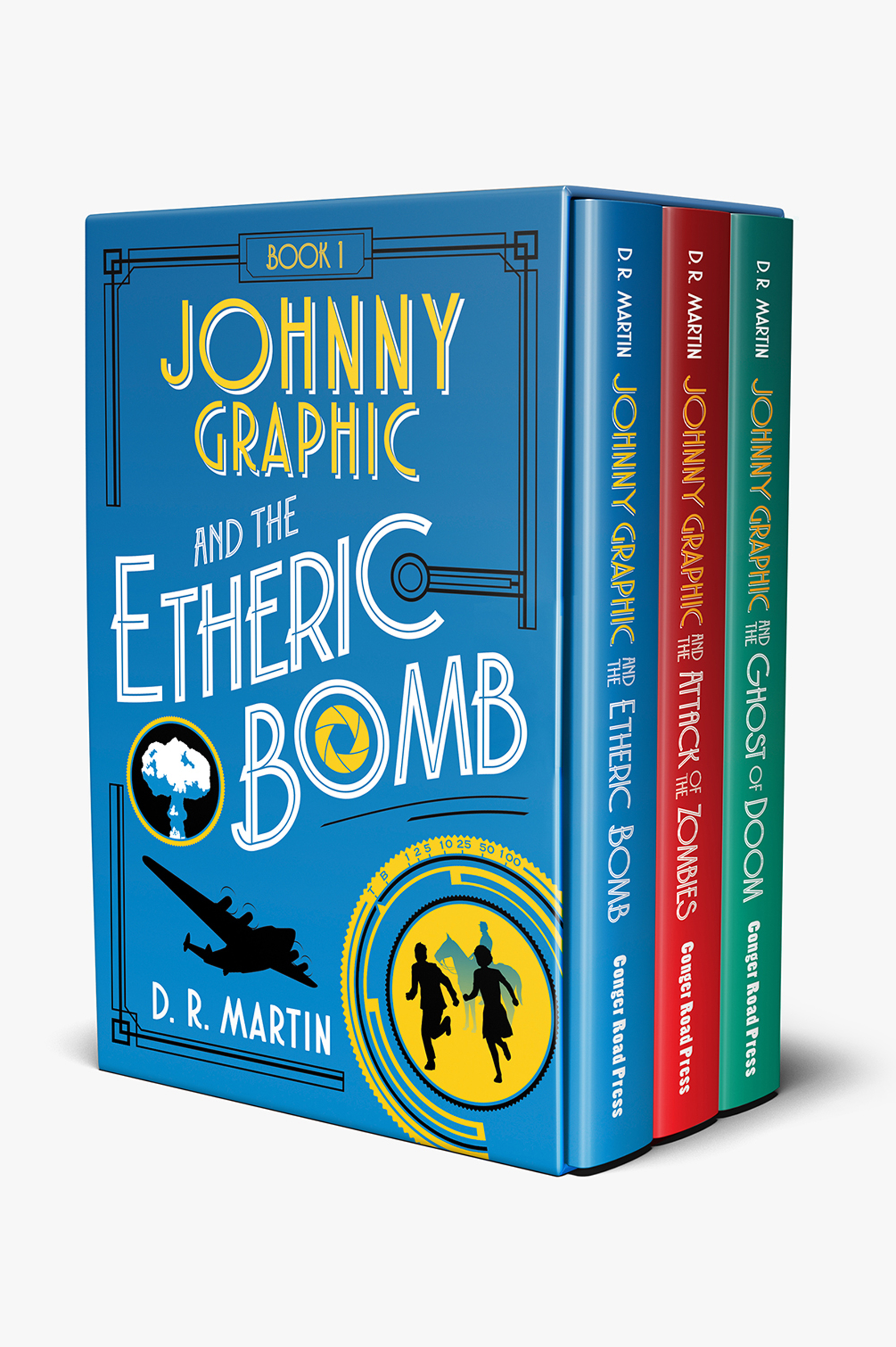 I’m especially psyched by the new cover style, which carries through all three books. My longtime designer Steve Thomas has done a terrific job of conveying the 1930s look and feel of the tales, while doing justice to Johnny and Nina’s rip-roaring exploits. The two twelve-year-old protagonists appear on each cover, along with their favorite ghost, Colonel MacFarlane. The artwork for each book includes unique elements from that story—mushroom cloud, zombies, flying boat, volcano, dog sled. I love the period-style typeface and the exuberance of the colors.