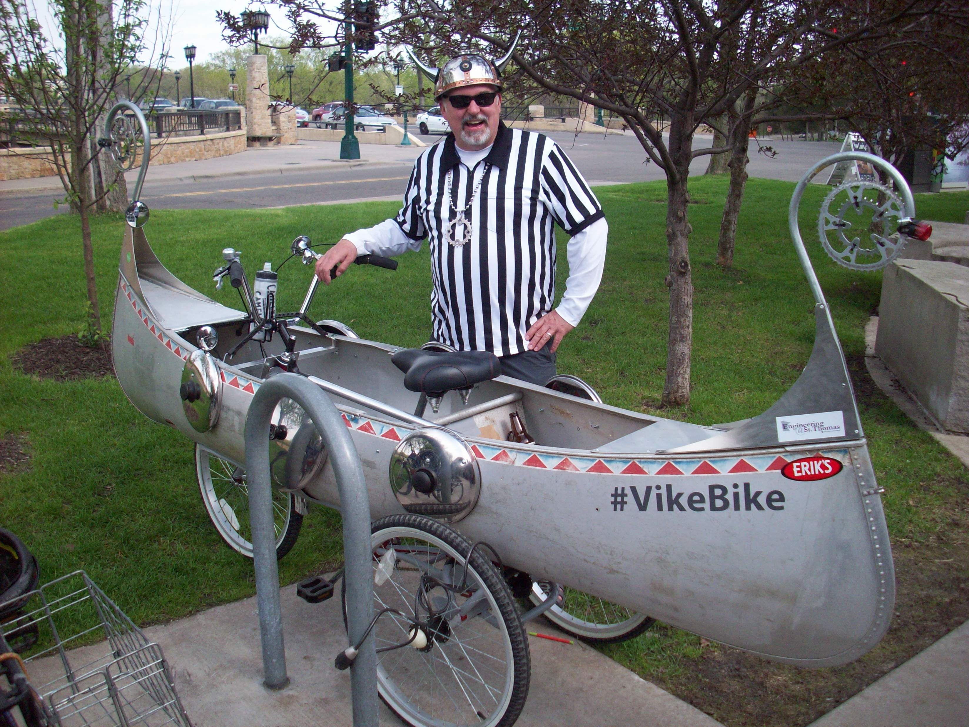 It was a tricycle inside a little canoe, pedaled by a guy in a Viking helmet. In lieu of a dragon head ornament, the Vike Bike’s captain–who built this vessel–had welded bicycle sprockets on both ends.